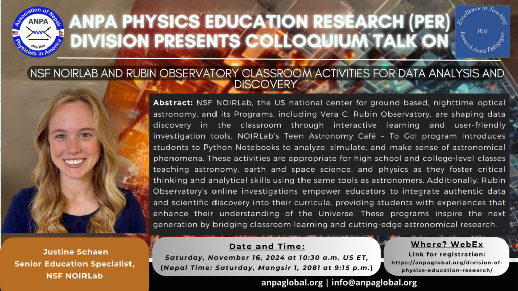 Justine Schaen, Senior Education Specialist, NSF NOIRLab will be presenting on “NSF NOIRLab and Rubin Observatory classroom activities for data analysis and discovery”